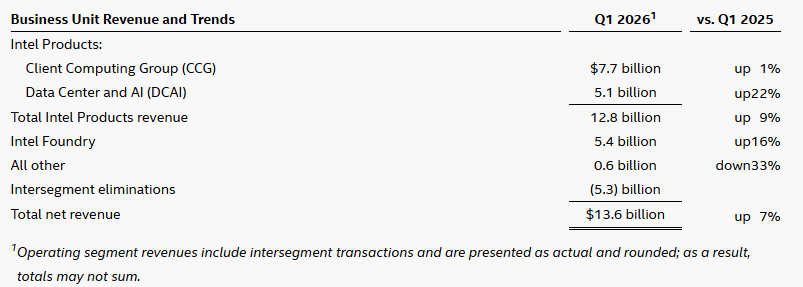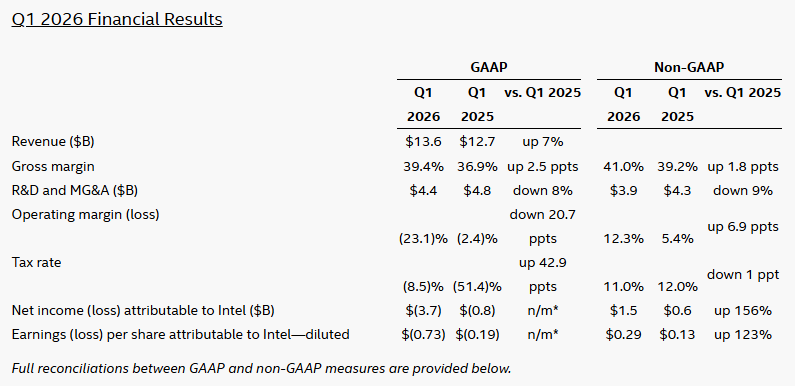 智通财经APP获悉,英特尔(INTC.US)发布了远超市场预期的第一季度业绩及第二季度业绩指引,表明这家长期陷入困境的芯片制造商正受益于人工智能(AI)的大规模建设浪潮。财报显示,英特尔一季度营收同比增长7%至136亿美元,大幅高于分析师平均预期的124亿美元。Non-GAAP净利润为15亿美元,同比增长156%;调整后每股收益为0.29美元,同比增长123%,同样大幅高于分析师平均预期的0.01美元。毛利率为41.0%,上年同期为39.2%。