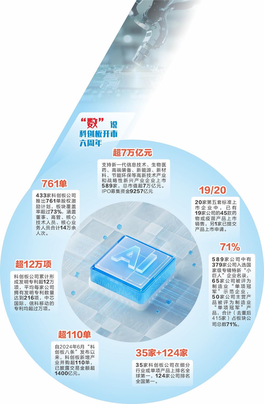 六年来,科创板始终坚守“硬科技”定位,充分发挥改革“试验田”功能,在探索中蹚出了一条从无到有、由小及强的跨越式发展之路。截至7月21日,科创板上市公司达589家,总市值超7万亿元,浇灌滋养着集成电路、生物医药、新能源等领域的一批批硬科技新苗茁壮成长。